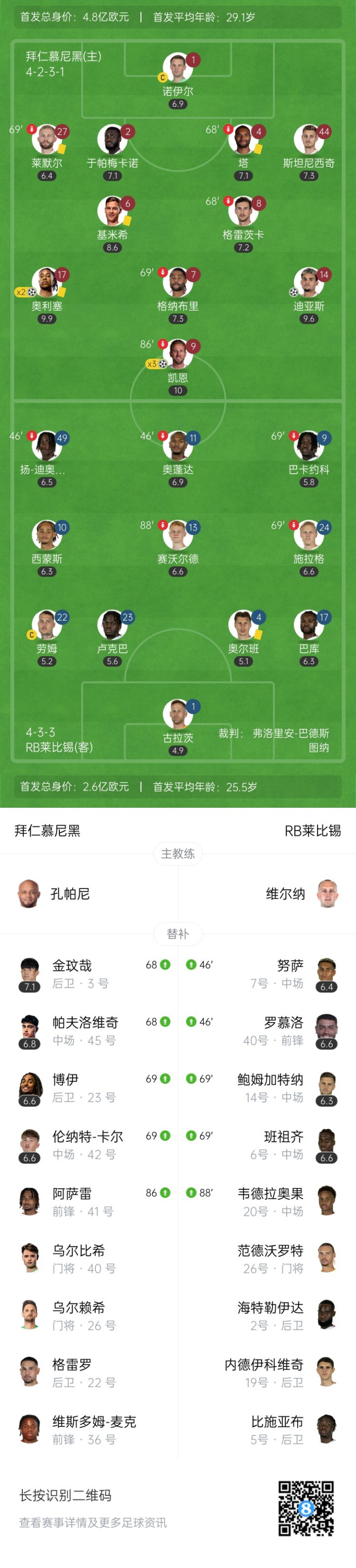 上半场伤停补时4分钟,半场结束,拜仁暂3-0莱比锡。